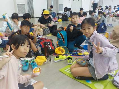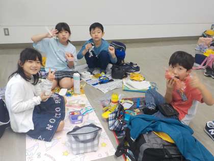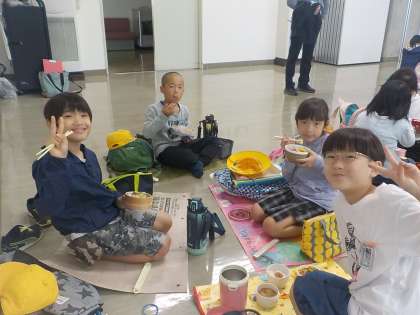 子供たちが、待ちに待ったお弁当タイムです。班の友達と、すてきなお弁当を見せ合ったり、おしゃべりしたりしながら、楽しく過ごしていました。写真は、1組の様子です。