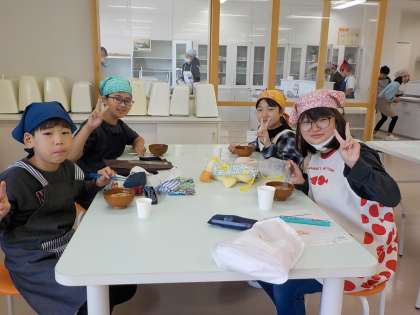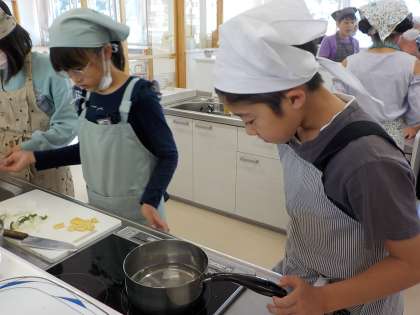 家庭科の学習で、みそ汁作りに挑戦しました。にぼしでだしを取り、手際よく作ることができました。おいしいみそ汁が完成して、笑顔でいただきました。明日は、2組が実習をする予定です。