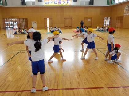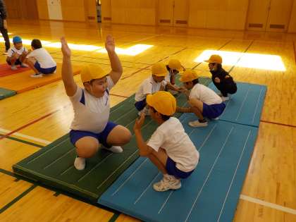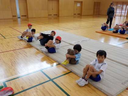 相撲大会に向けて、いろいろな運動を始めました。受け身をとる練習や手押し相撲等、楽しみながら取り組んでいます。