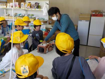 1組が町探検に行ってきました。お茶屋さん、白鳥神社、西富山駅に立ち寄りました。子どもたちは、見つけたことを話したり、気になることを質問したりしていました。