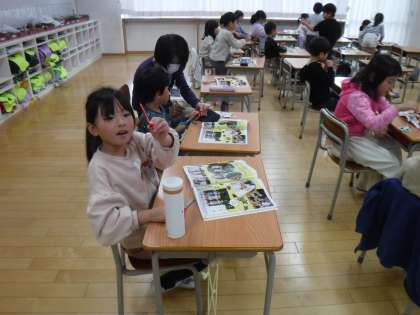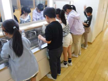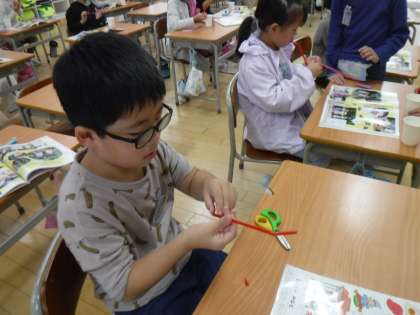 10月20日(金)生活科の学習で、シャボン玉作りを体験している1年生。ストローの先を切り、シャボン液をもらい・・・。こぼしてしまった友達を手助けしている素敵な1年生の姿がありました。