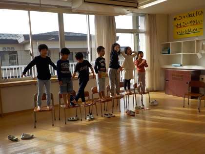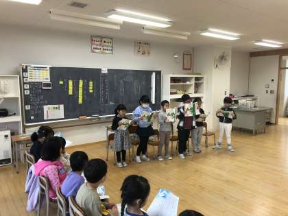 「くじらぐも」の学習では、文章から場面を想像して物語を読むのを楽しみました。最後には、くじらぐも、子供たち、ナレーターの3つの役に分かれ、読み方に変化をつけたり動きをつけたりしながら、楽しく読みました。