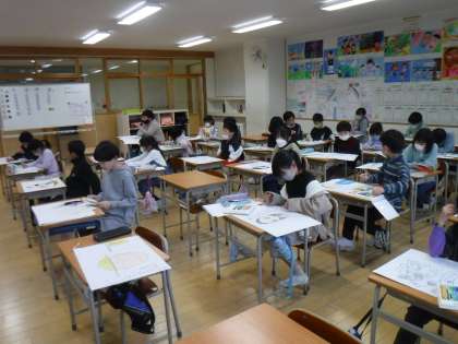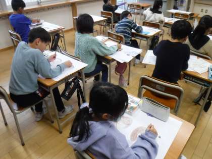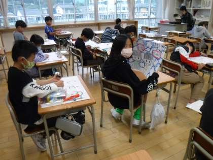 11月17日(金)3年生は、総合的な学習の時間に発表する「五福の素敵な人を紹介しよう」の準備をしていました。画用紙にイラストを描いて、分かりやすい説明する文章を考えています。