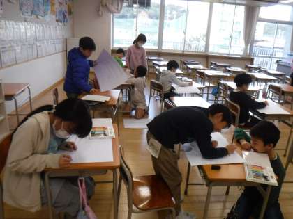 11月20日(月)3年生は、総合的な学習の時間に五福の素敵な人を紹介する発表を計画しています。画用紙いっぱいに紹介したいことを絵や図で表したり、友達に聞いてもらったりして準備を進めています。