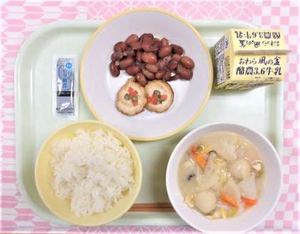 【献立】 ・ごはん ・牛乳 ・野菜の肉巻き ・煮豆 ・大漁鍋 ・のり佃煮