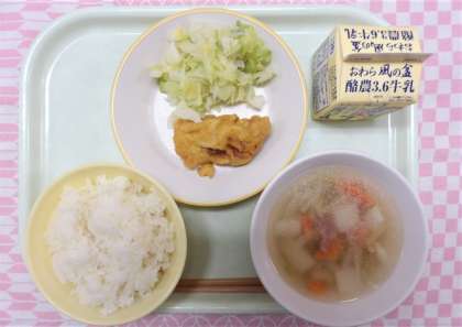 【献立】 ・ごはん ・牛乳 ・ポークパコラ ・ゆでキャベツ ・かぶのスープ