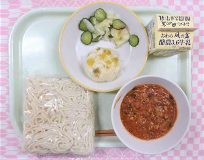 【献立】 ・ソフト麺 ・牛乳 ・ソフト麺のミートソースかけ ・蒸しパン ・白菜とりんごのサラダ