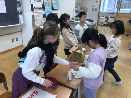 2年生が生活科の学習で作った動くおもちゃの集会に招待され、様々なおもちゃで楽しく遊びました。2年生が作ったおもちゃの様々な工夫に驚きながら、「自分も作ってみたい!」と来年に向けての意欲も高めている子供たちでした。