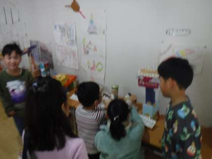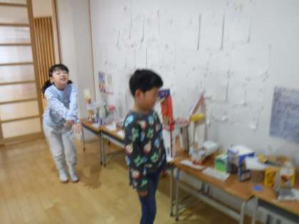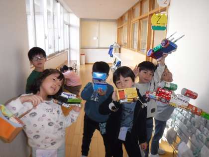 12月14日(木)1年生は、算数の時に使った箱を活用し、思い思いの作品を作りました。学習した平らな面や曲面の特徴を生かした作品になっています。