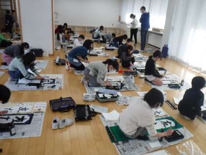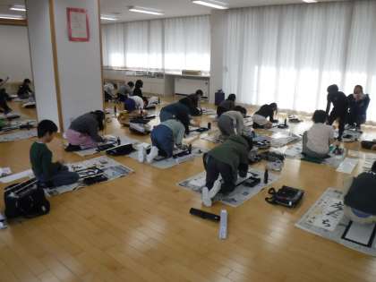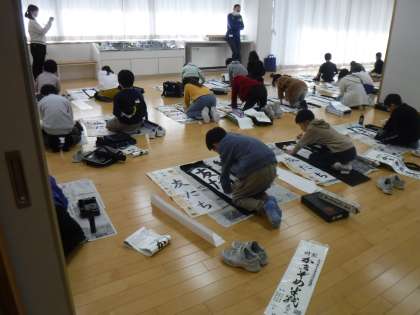 12月14日(木)3年生は、広い交流スペースで書き初めの練習をしています。長い下敷きに書き初め用紙を置いて書いています。