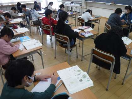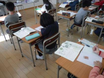 12月18日(月)2年生の国語科の学習です。「冬」と言えばと、思いつく物を絵と文で書き表しています。魚の“キス”や熊の冬眠など、子供たちの目の付け所が楽しいです。