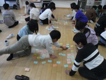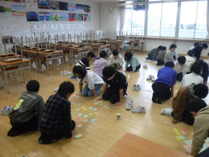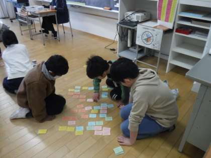 12月20日(水)5年生は、百人一首の練習を積み重ねています。この前は、机の上でしていましたが、今日は、いよいよ床で。上の句が読まれてからすぐ取る人もいます。