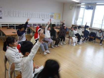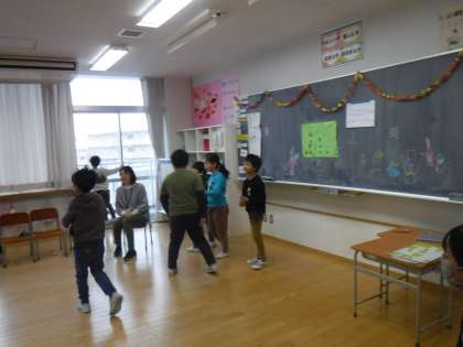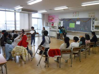 12月21日(木)2年生は、集会を行っているところでした。輪になって、ゼスチャーゲームに取り組んでいました。子供たち同士通じ合うところがすごいです。
