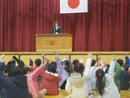 第2学期終業式を体育館で行いました。校長先生の話、代表児童の発表、冬休みの生活についての話を聞きました。校長先生から、各学年の2学期の成長したことについて話があり、子供たちは自分の生活を振り返っていました。