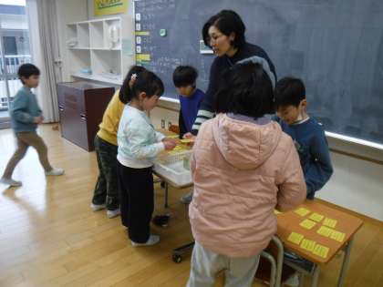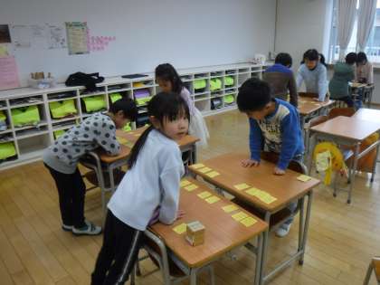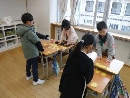 1月16日(火)1年生は百人一首の練習をしていました。随分札を見付けるのが早くなっています。上の句が読まれるとすぐに取れる子もいます。