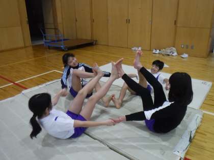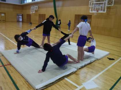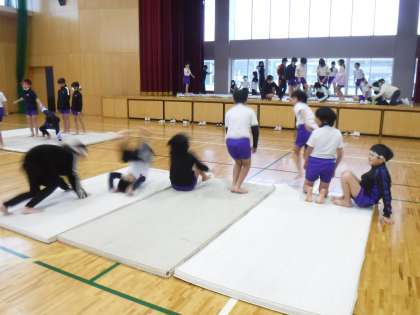 1月19日(金)5年生は、2クラス合同で体育の学習を行っていました。クラスを解体し、マット運動のグループ発表を行う予定です。仲良く相談しながら進めています。