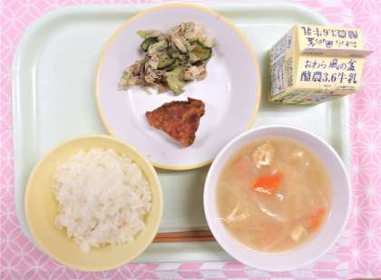 【献立】 ・ごはん ・牛乳 ・豚肉のかおり揚げ ・梅肉和え ・みそ汁