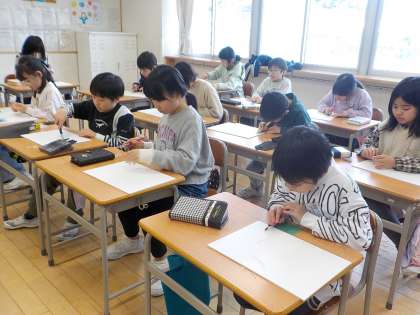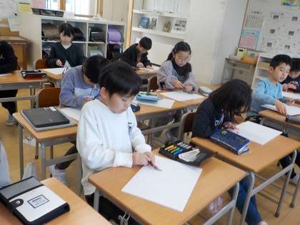 今日は、三角刀と小丸刀の使い方を確認し、まっすぐほる練習をしました。3年生で初めてチャレンジする彫刻刀を楽しみにしていた子供たち。始めは、なかなかうまく彫れず苦戦していましたが、少しずつきれいに彫れるようになってきました。本番では、いろいろな生き物を彫っていきます。