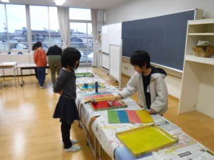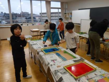 2月1日(木)2年生の方に行くと、ここでも版画を刷っていました。版に好きな色を、どのように置こうか考えて色付けしています。