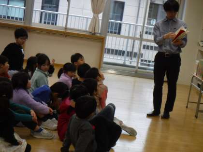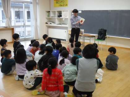 2月20日(火)1年生は、市立図書館から学校訪問に来ていただき、いろいろな本の紹介をしてもらいました。少し読み聞かせもしていただくと、静かに聞いたり反応して楽しんだりして、本に親しみました。