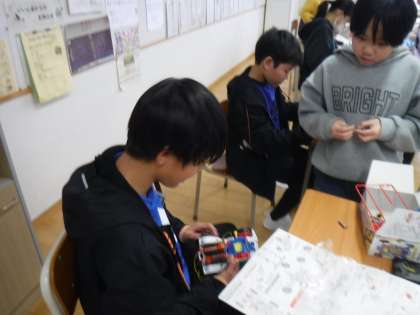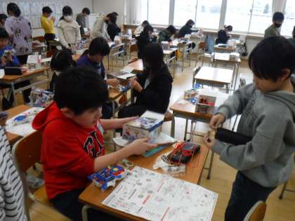 2月26日(月)5年生は、理科電磁石の学習で、モーターカーを作っていました。コイルと磁石、導線、電池をうまくつなぎ合わせ、モーターが回るように頑張っています。