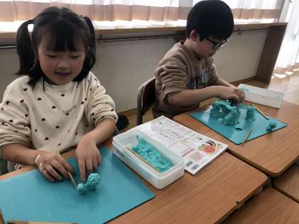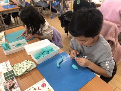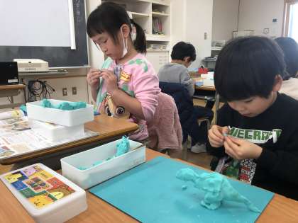 「○○といっしょにおさんぽ」をテーマにした粘土作品づくりをしました。自分や一緒に散歩するものがしっかりと立つように、粘土の形やつなげ方を試行錯誤しながら、夢中になって活動に取り組んでいました。