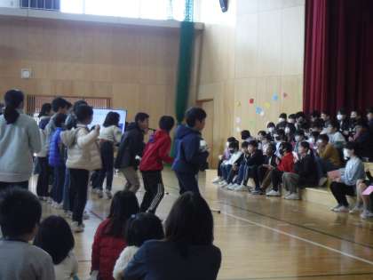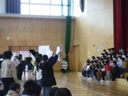 卒業を祝う集会の続きです。みんな工夫された出し物をしています。エール、合奏、クイズ、バラエティーに富んでます。