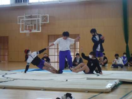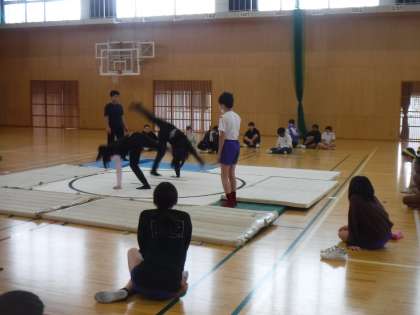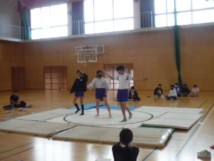 3月1日(金)卒業を祝う集会が終わった午後、6年生は体育で練習してきたマット運動の発表をしていました。それぞれの団をグループに分け、音楽に合わせて動きを作っています。和気あいあいとして雰囲気が漂っています。