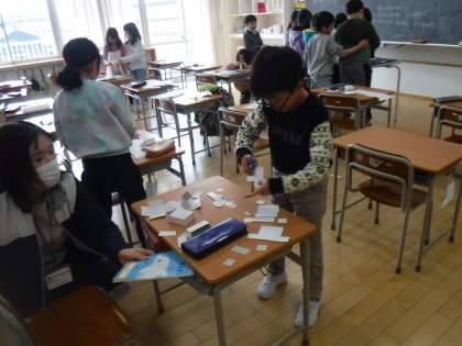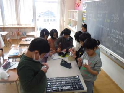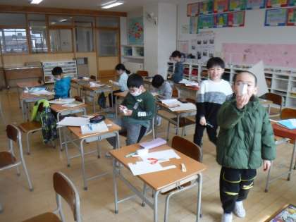 3月4日(月)2年生は、算数科の学習で箱を作っていました。画用紙を切り、セロハンテープで留めて、思い思いの形を作っています。辺の長さが違うと、違う形の箱になりますね。
