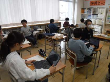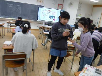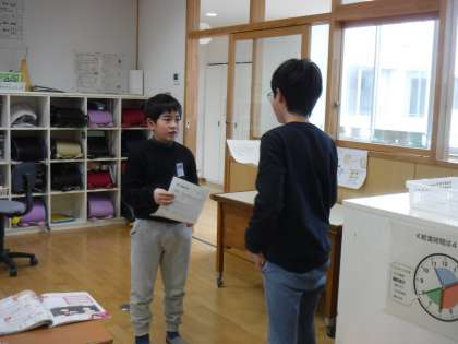 3月5日(火)5年生は、外国語科の学習で、スピーチの練習をしていました。「マイヒーロー」というテーマで、原稿を作っています。内容がうまく伝わるか、友達同士で聞き合っています。