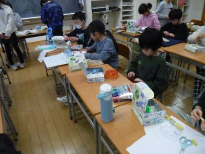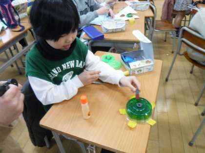 3月12日(火)3年生は、理科の学習でおもちゃづくりをしていました。電気かじしゃくのはたらきを利用して、思い思いのおもちゃを作っています。自分のこだわりのあるところがいいですね。