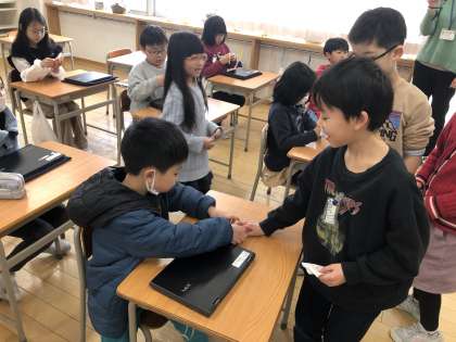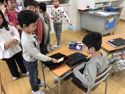 これまで学校案内や集会などで自分たちを楽しませてくれた2年生に、自分たちが育てたアサガオの種をプレゼントしました。