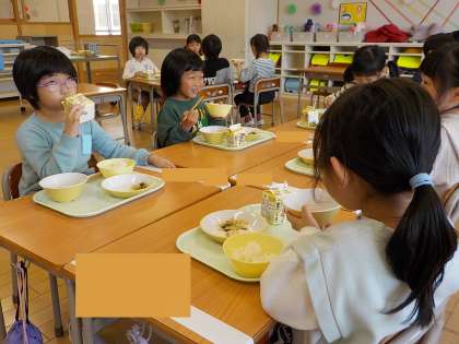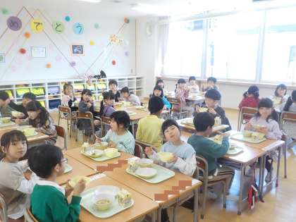1年生の給食が始まりました。仕事を分担して、自分たちで配膳しています。友達と話をしながら、楽しく食べていました。