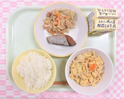 【献立】 ・ごはん ・牛乳 ・ふくらぎの照焼き ・はりはりソテー ・卵とじ