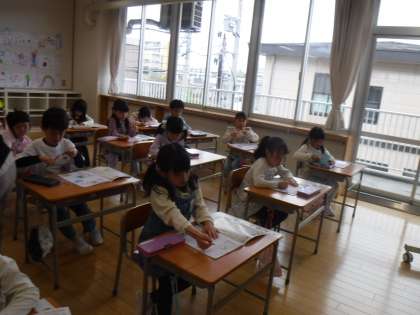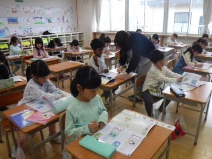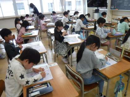 4月23日(火)1年生は、算数科の学習で、数字を書く練習をしていました。きちんと跡なぜしたり、お手本の字をよく見てかいたりしています。