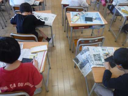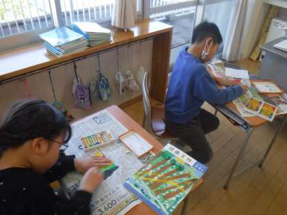 4月25日(木)3年生は、図画工作科の学習をしていました。四角い紙に好きな色のクレヨンで塗りつぶし、その上から黒いクレヨンで全面を被います。削ると下の色が出てきて、それぞれ個性的な作品になっています。