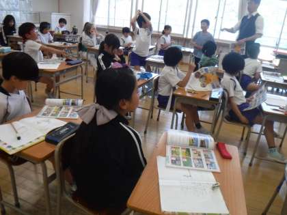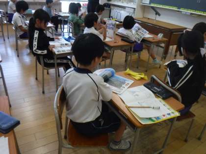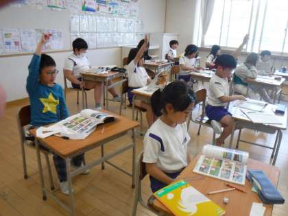 4月26日(金)3年生は社会科の学習で、地図記号を学んでいました。どうしてそのマークになったか考えを話し合っています。訳を知ると「なるほど」と納得している様子です。