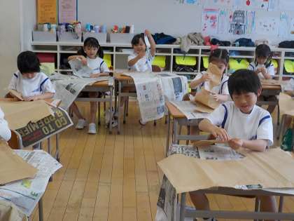 図画工作科では、新聞紙や包装紙をやぶいて、やぶいた紙がどんなかたちに見えるか考えながら、制作活動に取り組んでいます。