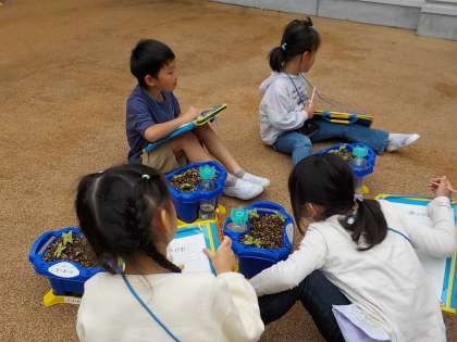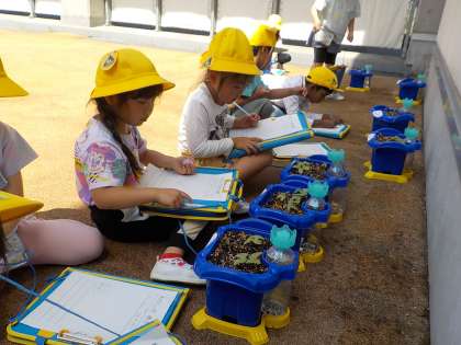まいた種から芽が出てきたので、みんなで観察しました。たくさん芽が出て、うれしそうな子供たちでした。