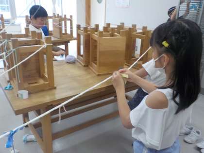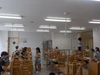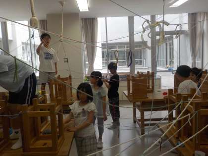 図工科「ひもでつないで」の学習では、家から持ってきた毛糸を繋いで図工室を変身させました。友達の毛糸と繋ぎながら、自分のお気に入りの場所を作りました。秘密基地のような場所を作る子、友達と協力して、クリスマスツリーのような場所を作る子など、楽しく活動しました。