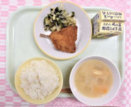 【献立】 ・ごはん ・牛乳 ・あじフライ ・海藻サラダ ・冬瓜のみそ汁