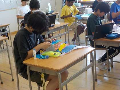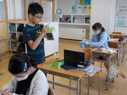 クランクの仕組みを生かして、動く作品を製作中です。スムーズに動くように調節したり、飾りにこだわったりしながら、夢中で作っています。