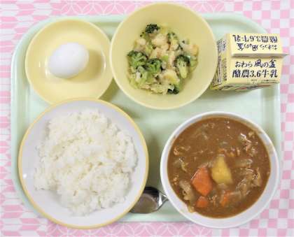 【献立】 ・ごはん ・牛乳 ・カレーライス ・ゆでたまご ・花野菜サラダ