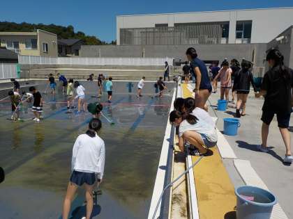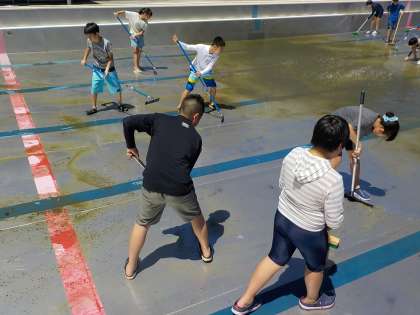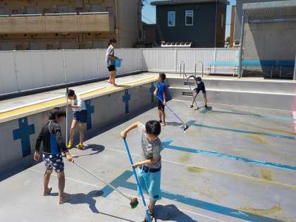 プール掃除をしました。ブラシやスポンジで一生懸命こすって、ピカピカにしました。暑い中ありがとう!来週から始まるプール学習が楽しみですね。