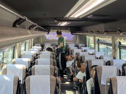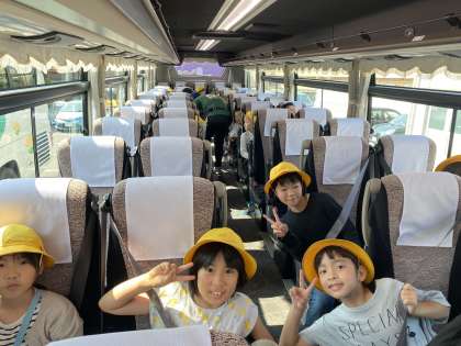 4年生は初めての宿泊学習に行きます。バスで呉羽青少年自然の家に向かいます。