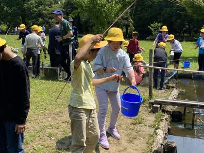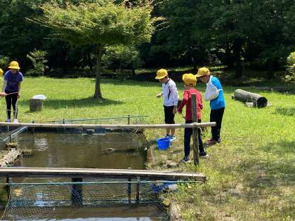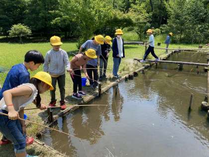 宿泊学習1日目午前は、ザリガニ釣りとグラウンドゴルフです。クラスに分かれ、取り組みます。