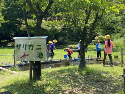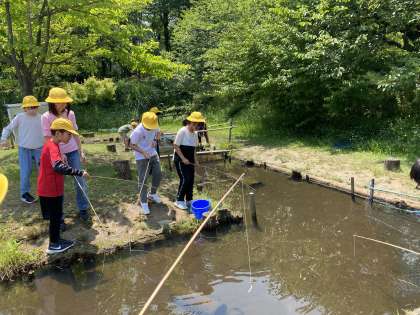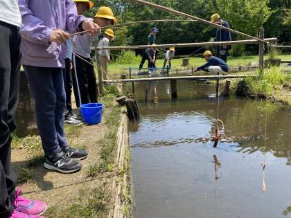 ザリガニ釣り。最初はどんどん釣れましたが、後半は、なかなか難しいようです。
