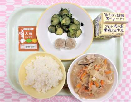 【献立】 ・ごはん ・牛乳 ・肉シューマイ ・しょうがひたし ・豚骨ラーメン ・大豆ふりかけ