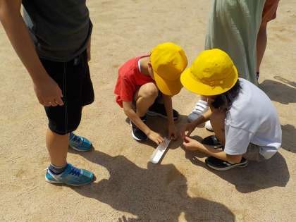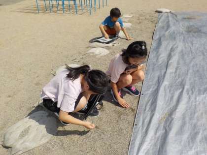雨水はどこからどこへ流れるのかを調べる実験をしました。ビー玉が動くととても嬉しそうな子供たちでした。また、砂の粒の大きさも調べました。粒の大きさの違いに驚いていました。