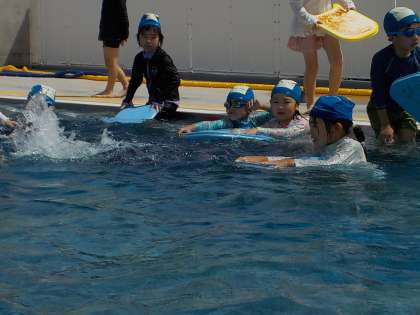 今日は、2回目の水遊びをしました。フラフープをくぐったり、宝探しをしたりしながら、水に慣れる運動遊びを楽しみました。